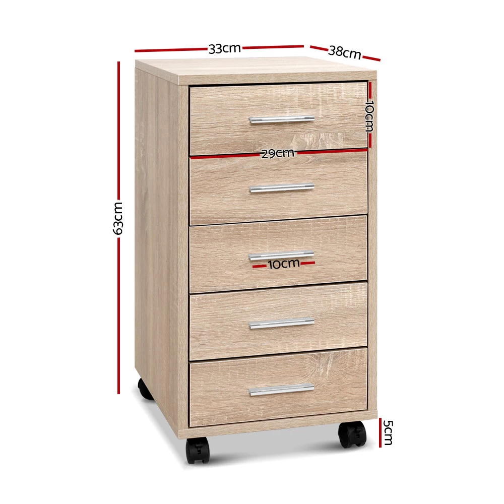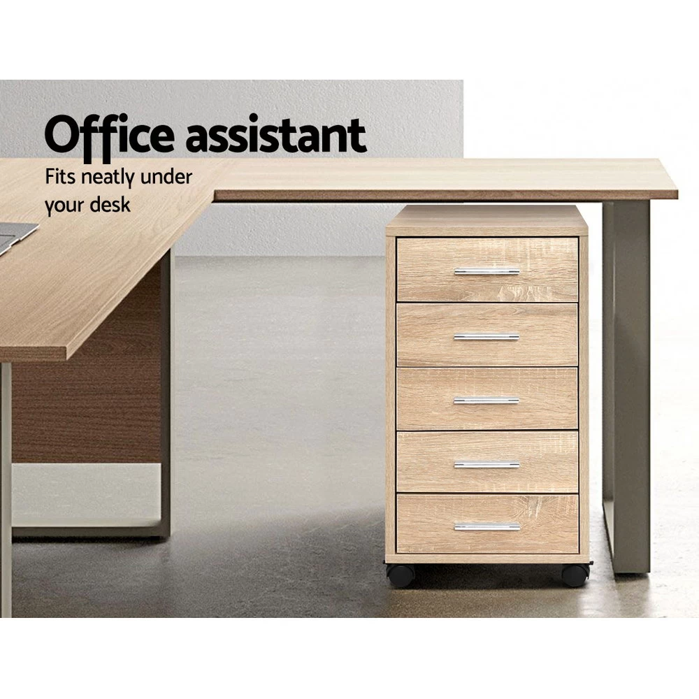 Is your office desk in a complete mess due to lack of storage? Get your desk organised with our Mobile Filing Cabinet. The modest cabinet is the ideal space-saving storage solution for your office, as it sits neatly under your desk. Despite its small footprint, five spacious drawers provide you with ample space to store all your workplace essentials. Crafted from quality particle board with smooth melamine finish and featuring anti-rust drawer runners and sleek drawer handles, the cabinet is durably constructed to ensure longlasting use and smooth operation. Better still, the cabinet has four castor wheels, with two lockable, allowing you to easily wheel it around desk to desk or room to room. Best of all, the modernistic design with neutral wood tone means it will suit any decor and will be the perfect addition to your living room, study room or children’s desk.