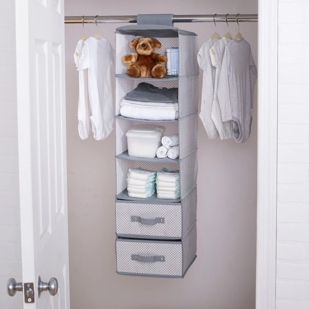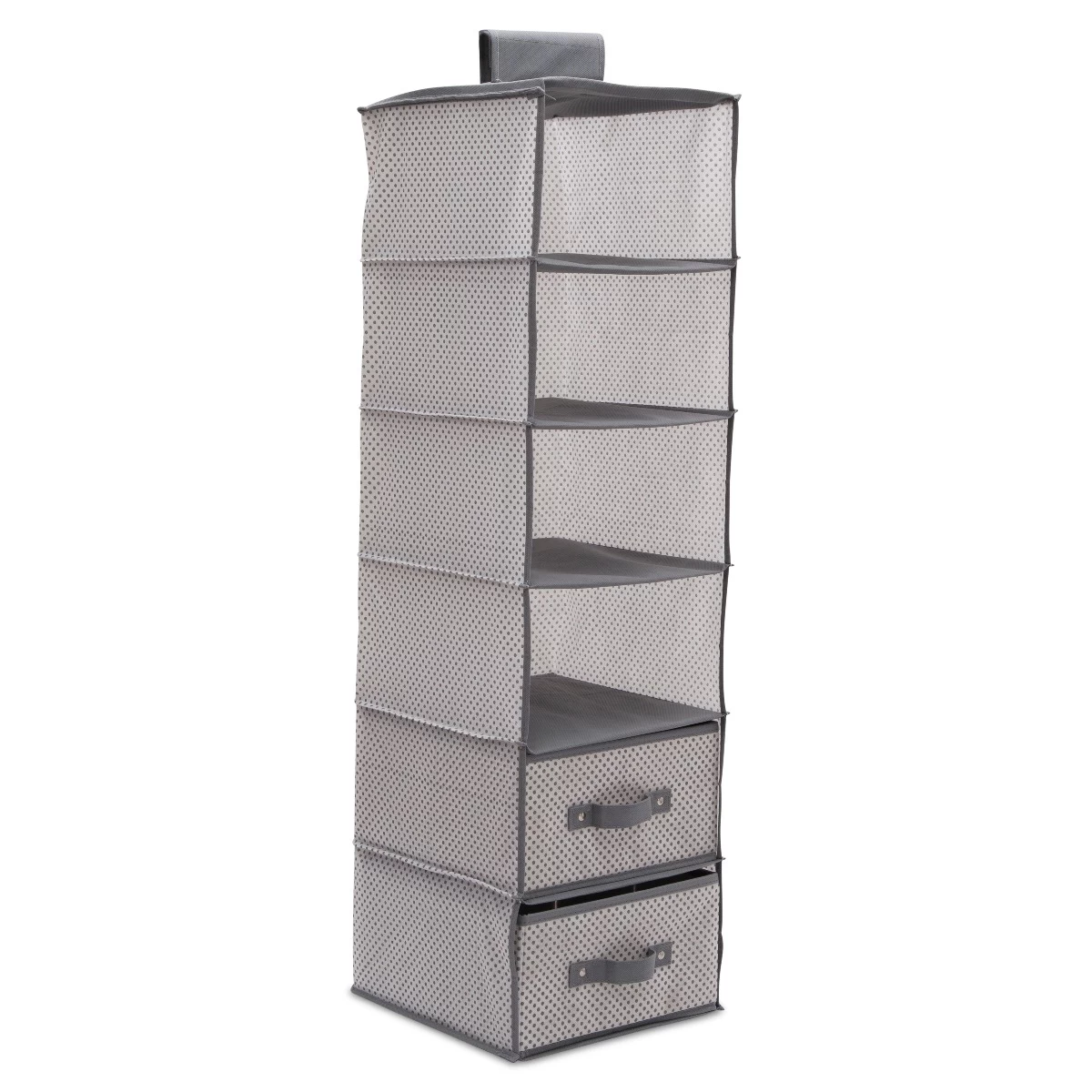 Welcome a world of order with this 6-Shelf Hanging Storage Unit with 2 Drawers from Delta Children! A smart and durable solution to make sense out of discarded toys, blankets or bodysuits in your babys nursery, this handy storage piece comes with two removable drawers and hook and loop top that easily attaches to most closet rods.