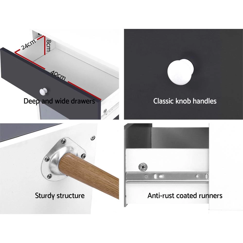 A design that is Scandinavian-inspired and yet reminiscent of decades-old influences, our Artiss 5-drawer Tallboy offers full functionality with stylish cues. Made from quality particle board with smooth paper veneer finish, the two-tone tallboy adds some chic appeal to your decor and is the perfect choice to grace any dressing room, bedroom, living room or any other space in a discerning home or establishment. The splayed legs add a unique stance to this very able tallboy that also comes with classic knob handles and smooth anti-rust metal drawer slides for hassle-free use. Not least, ample storage space is found with the five generous-sized drawers for all your clothing, fashion accessories, personal essentials and more.