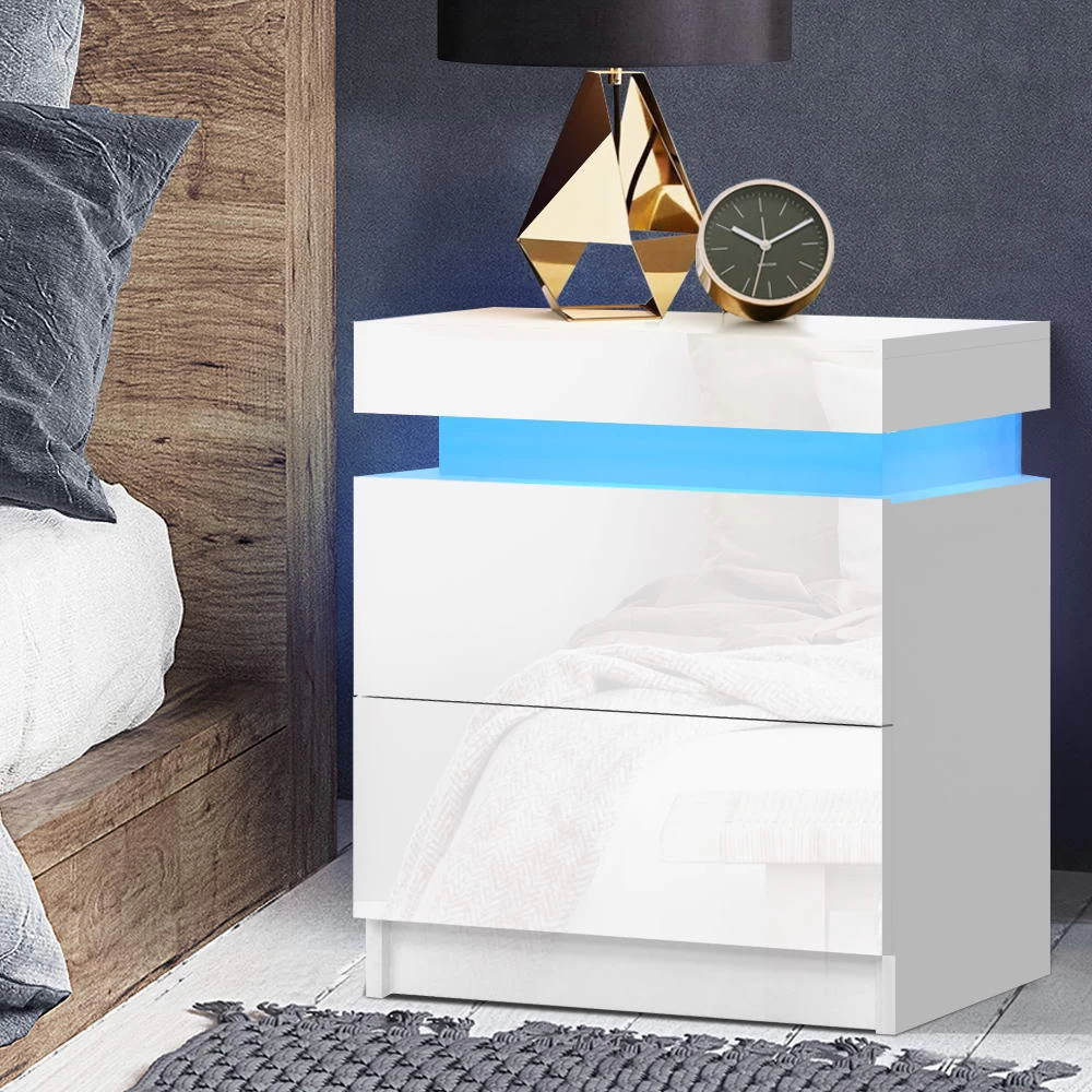 Tired of fumbling in the dark for a light switch in the middle of the night? With our Artiss LED Bedside Table, your problems are solved. The bedside table comes with built-in LED lighting that can be customised into 16 different colours to suit your preference. Not only will it create a beautiful ambience, it will also save you from buying extra bedside lamps or nightlights. Two deep drawers sliding on smooth anti-rust runners provide ample storage space. There is also a top storage compartment that opens with a lift-up lid like a treasure trunk, which you can fittingly fill with your own personal treasures. Better still, the handle-free design gives it a modern vibe that stands out from the mundane. Quality made with 15mm thick melamine particle board and UV high gloss finish, the bedside table is durable and easy to maintain. And it will be the perfect addition to your modern bedroom with its contemporary and linear design. Or you can keep one in the living room to wow all your houseguests.