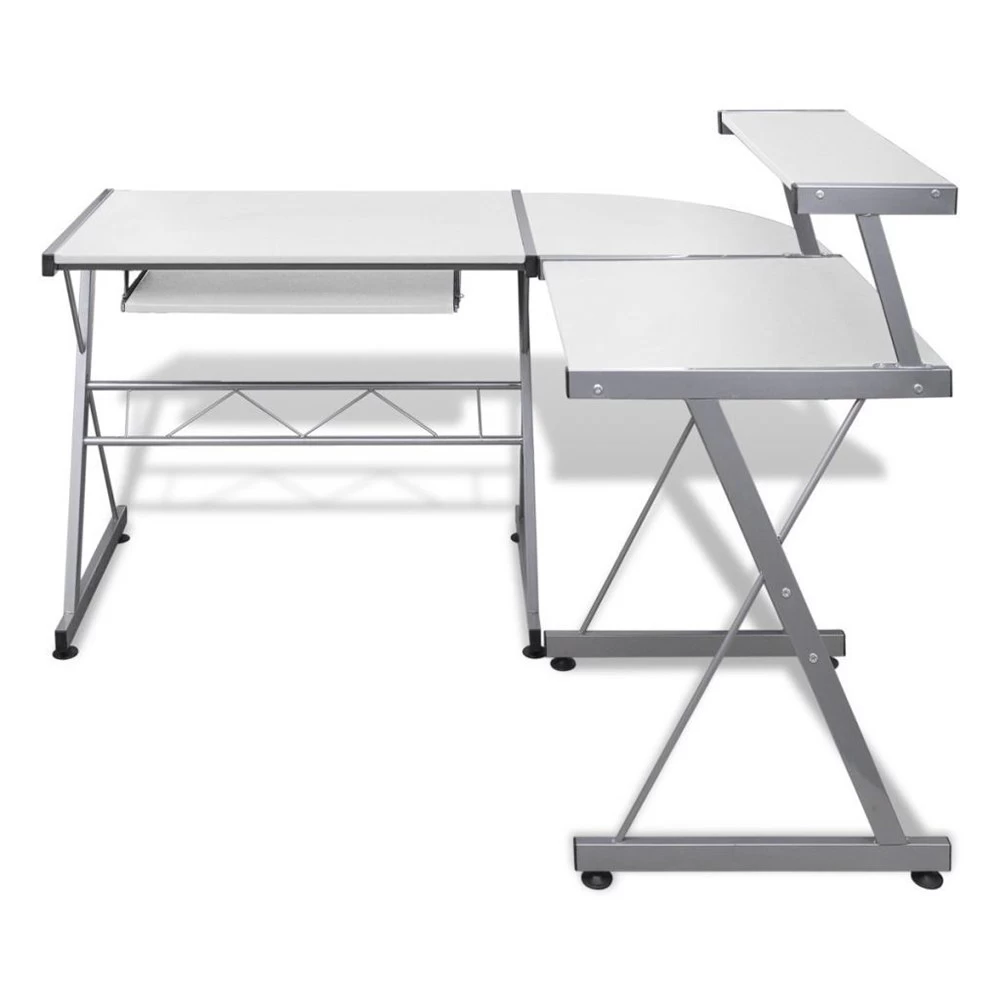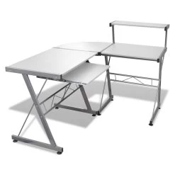 This three-piece desk includes two rectangular desktops and a quadrant-shape desktop, all smartly linked together to form an L-shape work area that is perfect for corners or adjoining spaces. There is also a pull-out keyboard tray to work in conjunction with your computer and a top shelf for additional work paraphernalia.