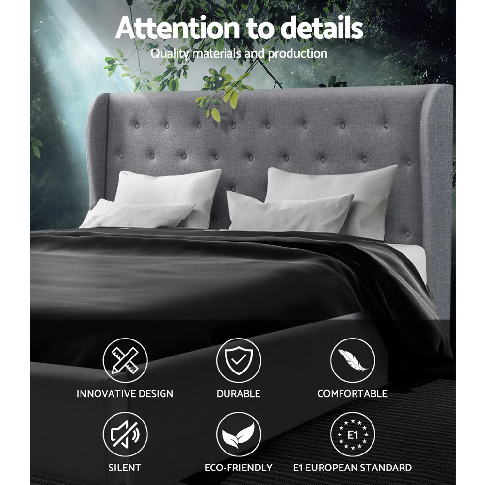 It is time to lie down and rest in total glamour and style. Beautifully padded with generous foam and covered in a faux linen fabric, this is the luxurious bed frame you all deserve. The elegant tufted headboard brings the prestige, whilst the strong steel frame with reinforced steel bars and a wooden arched slat base can put your mind at ease as you know you are sleeping on quality. One of the best qualities is the fact the bed frame has a gas lift which creates an instant storage area with ample space for you to hide away your items. This bed frame has brains and beauty!