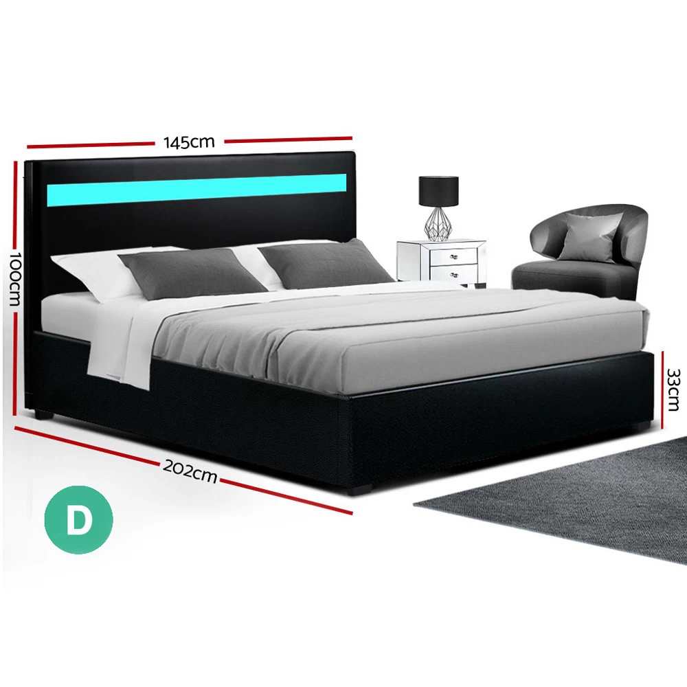 On the outside, this bed frame looks like just any other quality bed frame. Beautifully padded with generous foam and covered in PU leather. Strong steel frame with high grade steel centre rails, heavy-duty bars and arched slat base. Large and comfortable headboard. But with one easy gas lift of the bed base, the bed frame becomes an instant storage area with acres of space for your bedding essentials. Simply store your extra pillows, bed sheets, cushions and more in the storage compartment and hide them away for the season. Even better, you no longer have to fumble in the dark for a light switch in the middle of the night with this bed frame. It comes with built-in LED lighting that can be customised into 16 different colours and 4 flashing modes to suit your preference. Not only will the illuminated bed frame create a beautiful ambience, it will also save you from buying extra bedside lamps or nightlights.