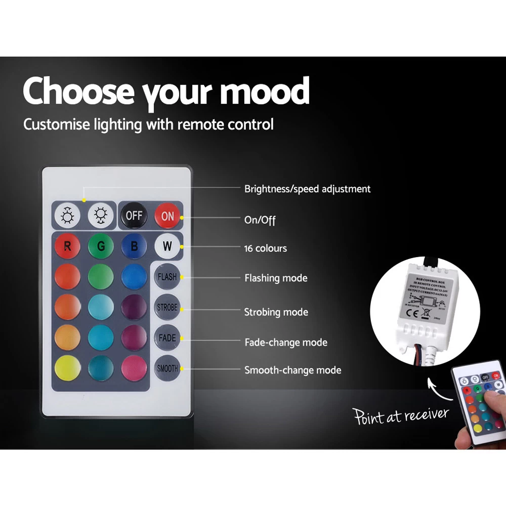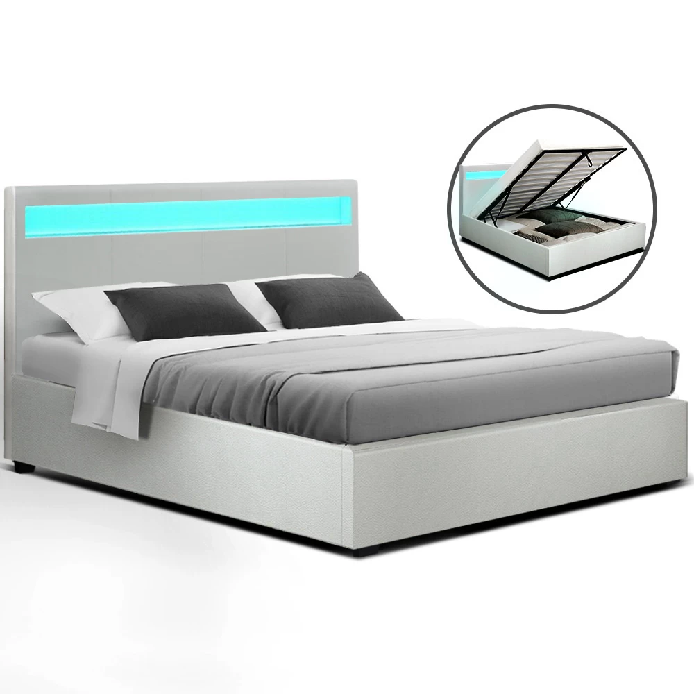 On the outside, this bed frame looks like just any other quality bed frame. Beautifully padded with generous foam and covered in PU leather. Strong steel frame with high grade steel centre rails, heavy-duty bars and arched slat base. Large and comfortable headboard. But with one easy gas lift of the bed base, the bed frame becomes an instant storage area with acres of space for your bedding essentials. Simply store your extra pillows, bed sheets, cushions and more in the storage compartment and hide them away for the season. Even better, you no longer have to fumble in the dark for a light switch in the middle of the night with this bed frame. It comes with built-in LED lighting that can be customised into 16 different colours and 4 flashing modes to suit your preference. Not only will the illuminated bed frame create a beautiful ambience, it will also save you from buying extra bedside lamps or nightlights.