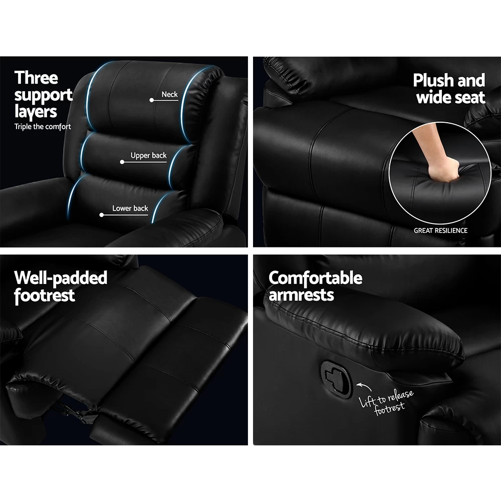 Enjoy the gold class movie experience in your own home with our Artiss Recliner Chair. Richly padded in high-resilience foam and upholstered in smooth and luxurious PU leather, the chair certainly looks like it belongs in gold class. In the upright position, the recliner is a comfortable armchair where you can sit for long chats with guests. Or you can easily adjust the backrest and footrest to recline to your preferred angle. The backrest has three padded zones for full head and back support so that no matter the tilt, you have total body comfort. The chair is suitable in any room with its classic design. Keep it in your study to be perfectly rested during your work breaks. In the living room for watching television or listening to music. Or keep several in the media room for the complete cinema experience. Wherever you decide to put it, you can always sit back and relax on our recliner chair.