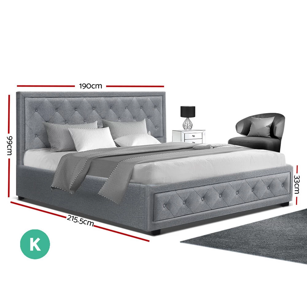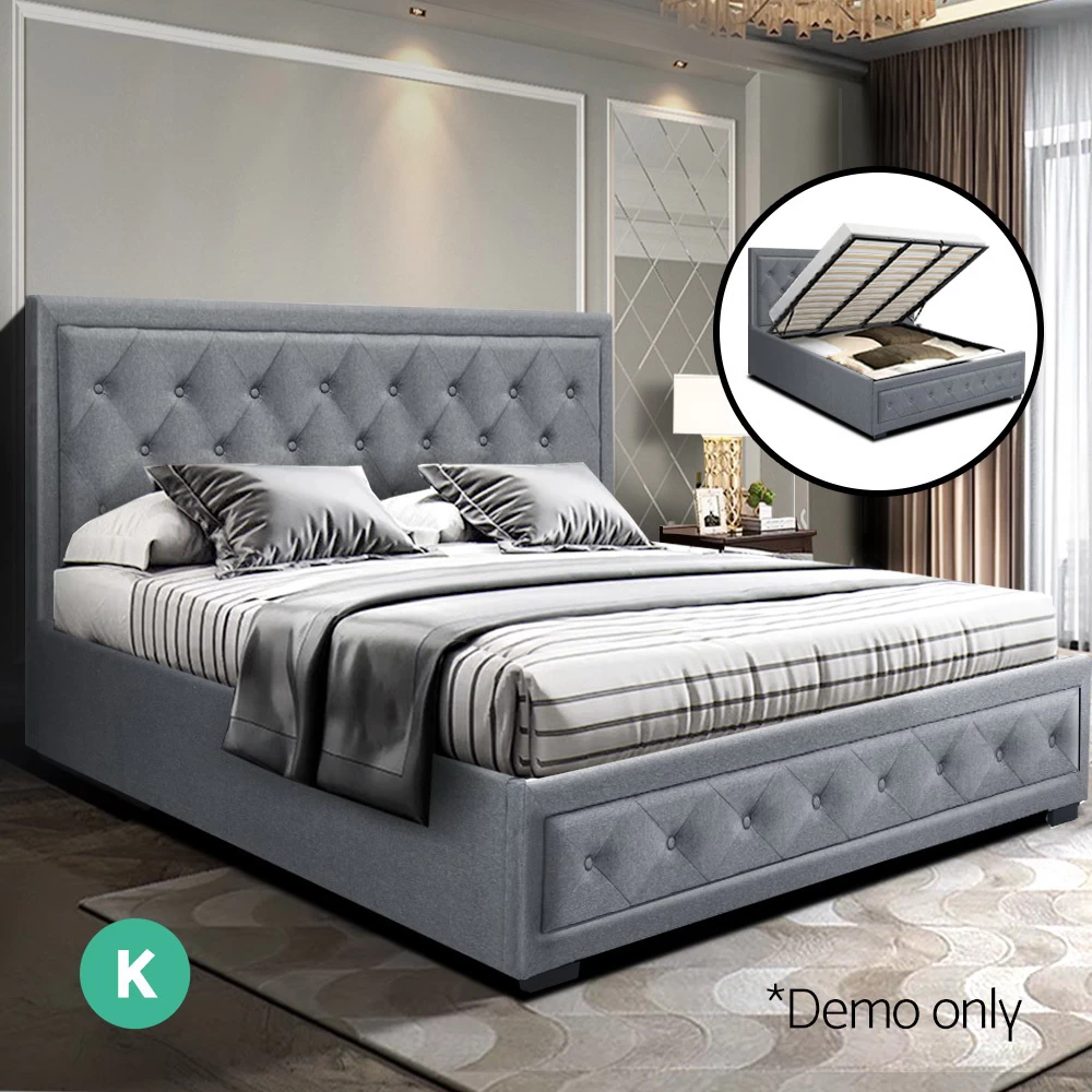 From the outside, our contemporary Artiss Tiyo Gas Lift Bed Frame looks absolutely plush. Beautifully padded with generous foam and upholstered in premium linen fabric. But there is more to this luxurious bed frame than meets the eye. Lift up the frame and you will find acres of storage space under the wooden arched slat base. The gas lift system and hand strap enable you to effortlessly lift the bed to store all your seasonal beddings and linen such as extra quilts, pillows and comforters and more. The wooden arched slat base is also designed to flex appropriately so that it can better distribute the weight exerted on it. Overall, the bed frame is well-built with reinforced steel bars within its sturdy steel frame. Heavy-duty metal connectors keep the frame sturdy with additional central support from an adjustable centre support beam.