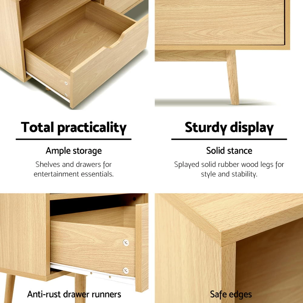 With its clean lines and smooth, natural timber veneer finish, the TV Cabinet offers a multitude of storage spaces and yet conveys a light and fresh appeal to the senses. The iconic tapered rubber wood legs give the ensemble a nostalgic and yet modern disposition while the three top open shelves and bottom drawers present a beautiful symmetry across its elongated, timeless design. Indulge in practical sophistication captured in fine style with our Nordic-influenced TV Cabinet. Get yours today.