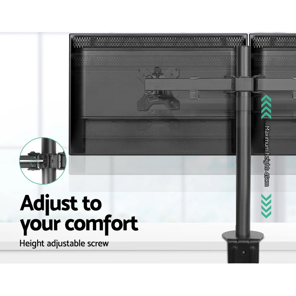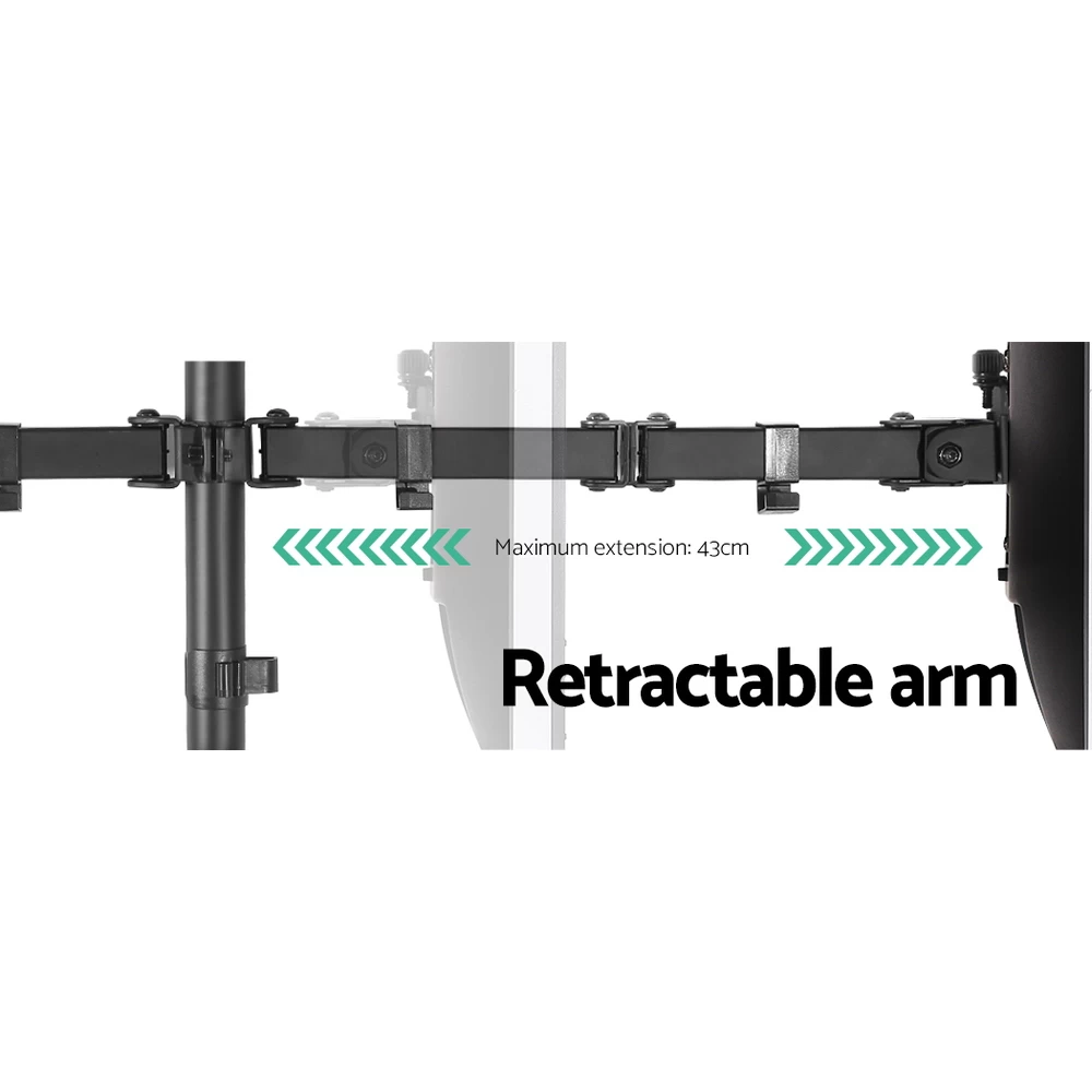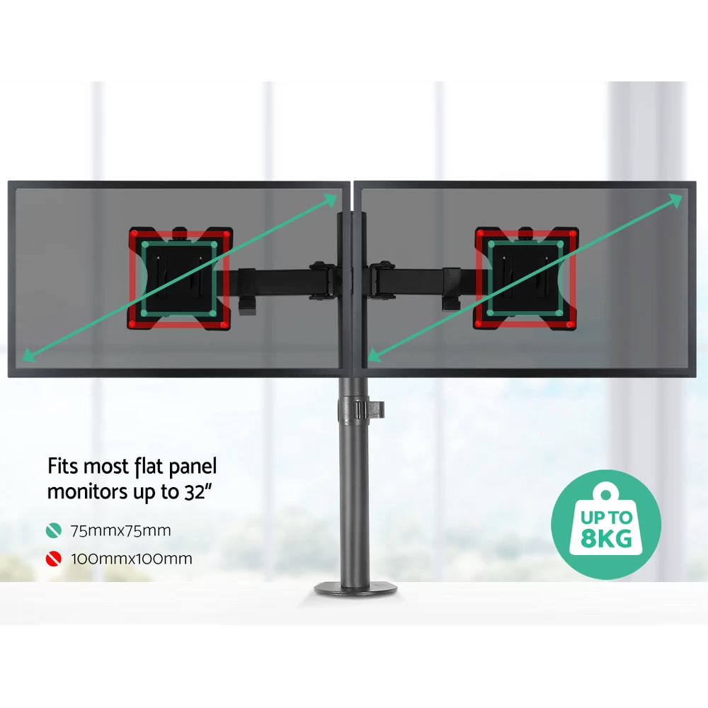 Add some extended mobility to your monitor with our Artiss Fully Adjustable Dual Monitor Arm. With it, you can extend both arms up to 43cm to set your preferred viewing position and retract it with ease. Height adjustments can be easily done by twisting the height adjustment screw. It also allows you to swivel your monitor 180, rotate it 360 or tilt it up to 45 and set in either landscape or portrait format. Using the detachable VESA mount, you can mount any monitor size of up to 32 with a maximum weight capacity of 8kg on each arm. Plus, you can also fine tune the monitors alignment with the VESA plate height adjustment. Other great features include alternative setups, cable loops for neat and tidy cabling and a tools holder for allen keys. Not least, made from heavy-duty steel, the monitor arms are designed to stand up to longlasting use without missing a beat. All the necessary mounting hardware and an assembly manual are included in the package for a hassle-free set up.