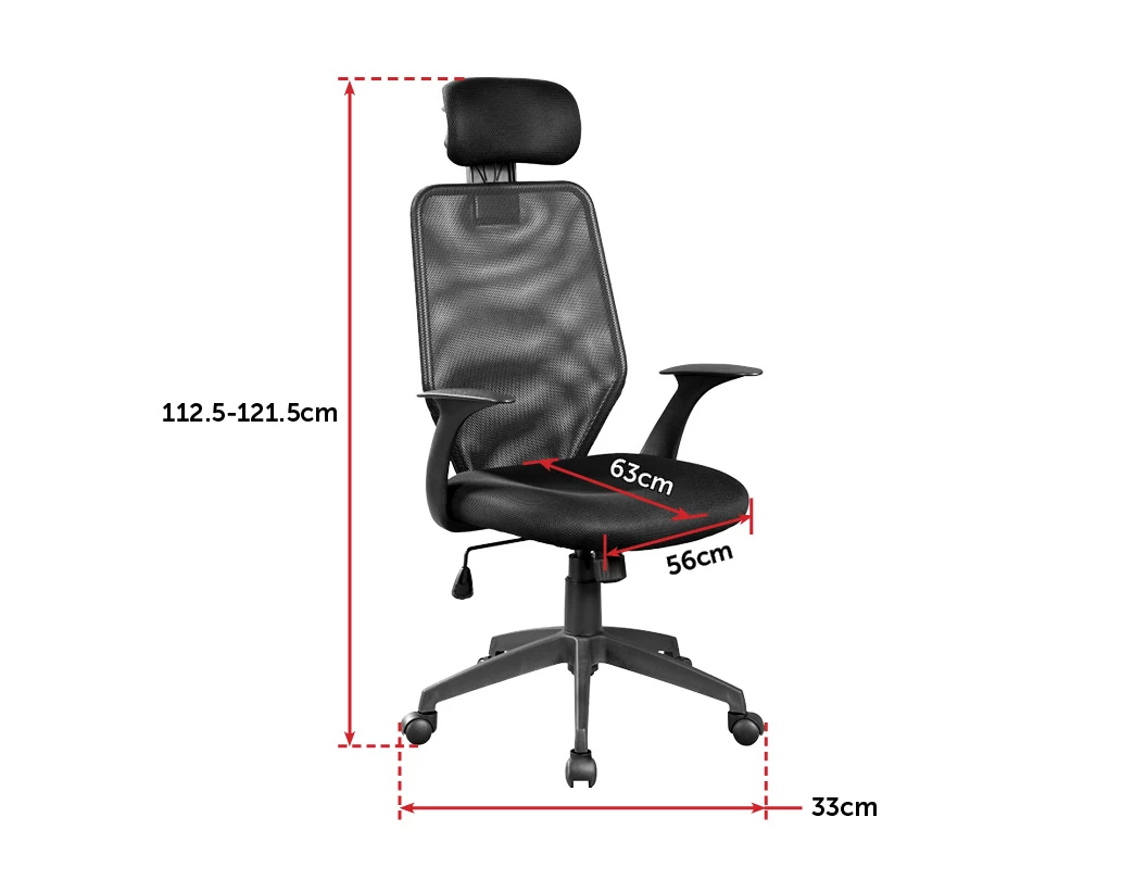 The chair is constructed with a black mesh for superior comfort which conforms to your back and spinal column, giving you the energy and proper support to power through the day. A dedicated headrest is perfect for leaning back and taking a little break. A convenient gaslift makes height easily adjustable from 118.5cm to 128.5cm. And a nylon base with 5 castor wheels provide an easy way to rotate and wheel around.