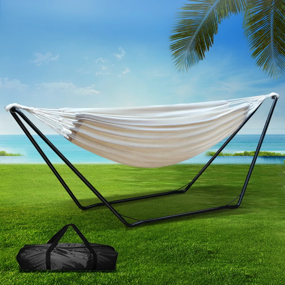 Our Gardeon Hammock with Stand will get you comfortable in no time at all. Made from 100% cotton fabric, our hammock is soft, comfortable and well-ventilated. Plus, the strong and sturdy stand is constructed of heavy-duty steel with a powder-coated finish for durability and reliability in all kinds of weather use.Simple and easy in every way.