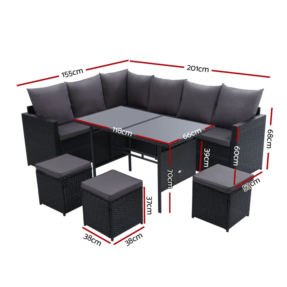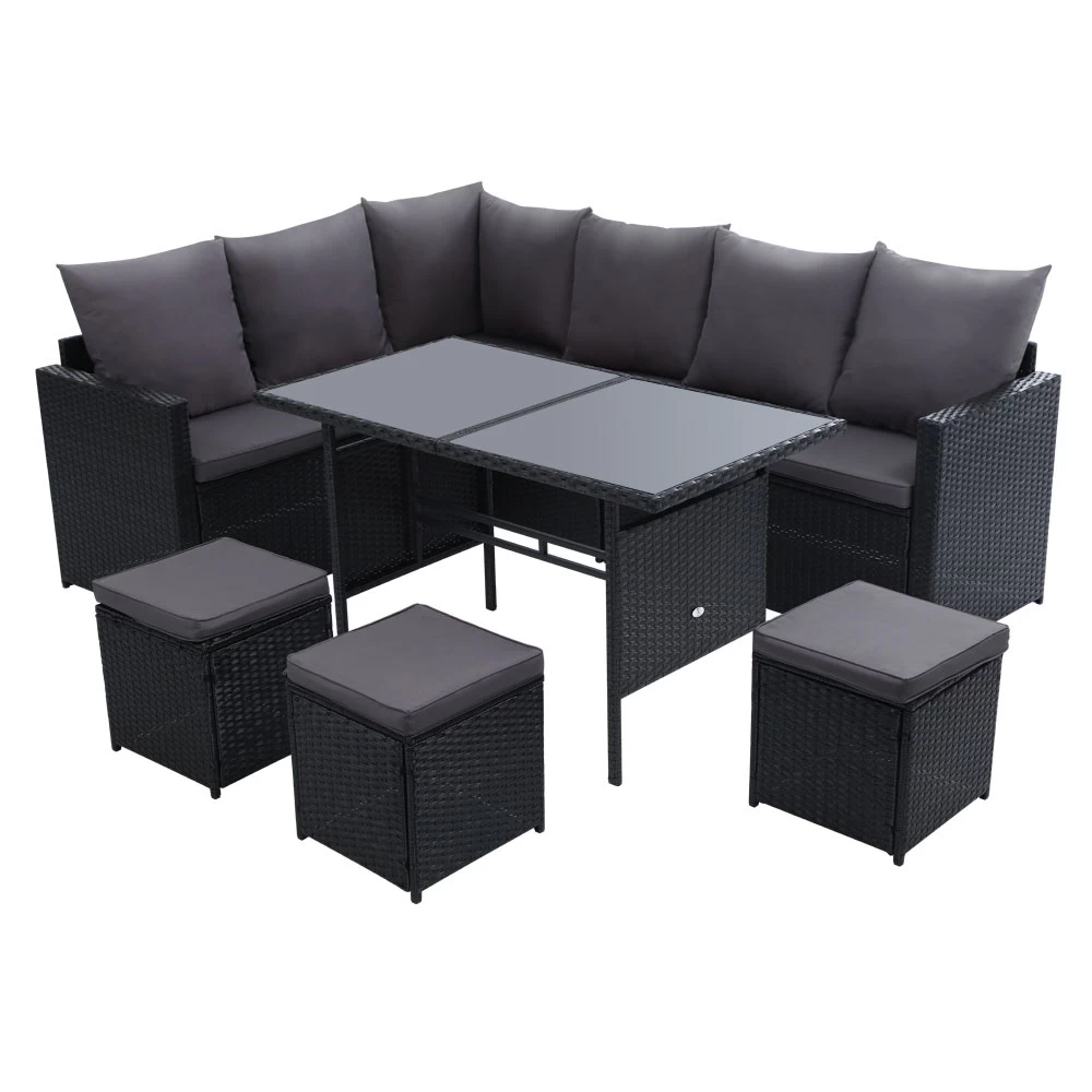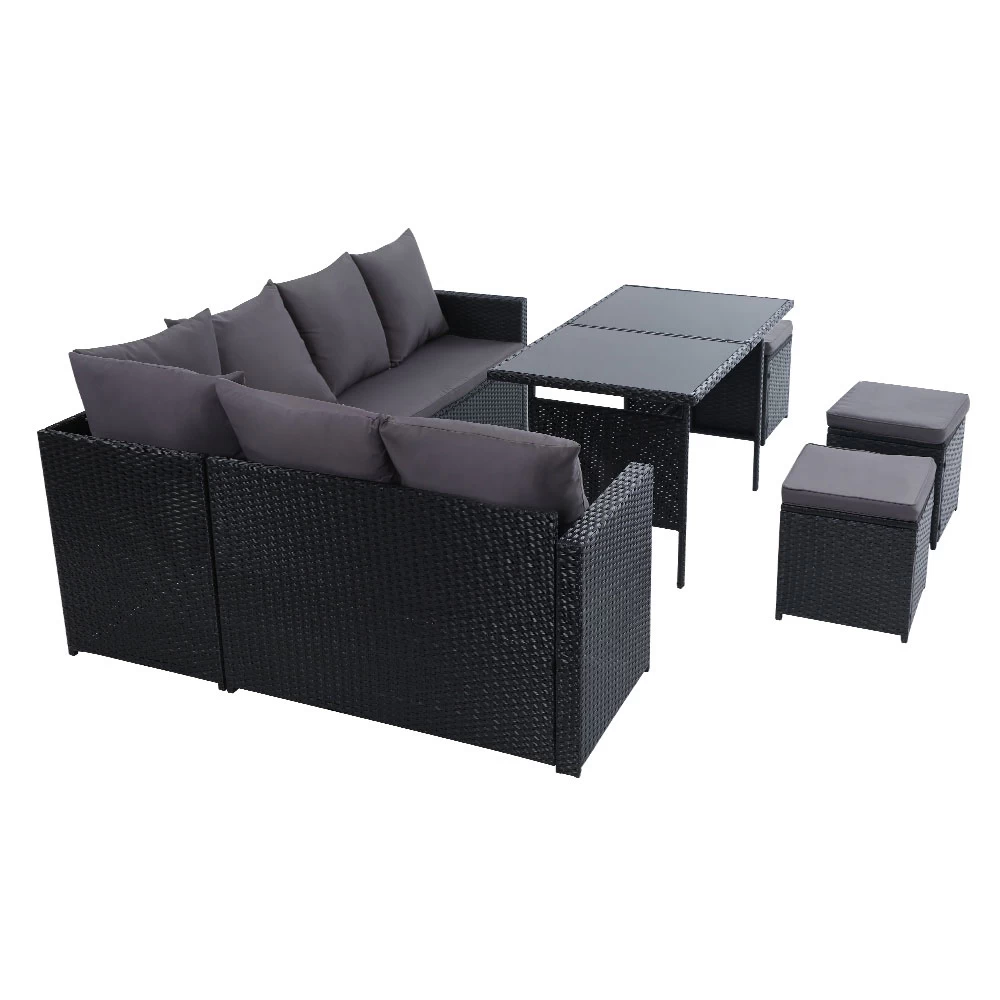 Invite your friends and family over for a garden party or just sit back and relax with our Gardeon Outdoor Sofa Dining Set. Being a 9-seater, the dining set provides enough room for all your guests to sit or for you to have a lie down and enjoy a book. You can arrange the seats in various ways depending on your needs and there are hooks included to secure the seats firmly together. The sofa is made of sturdy powder-coated steel frame with quality PE wicker finish that not only looks stylish but is perfect for outdoor use as it is both UV-resistant and weatherproof. The cushions and pillows on the sofa are 5cm thick to provide ultimate comfort and are waterproof as well. The set also includes a matching table that has a 5mm tempered glass top with buffers for added protection.