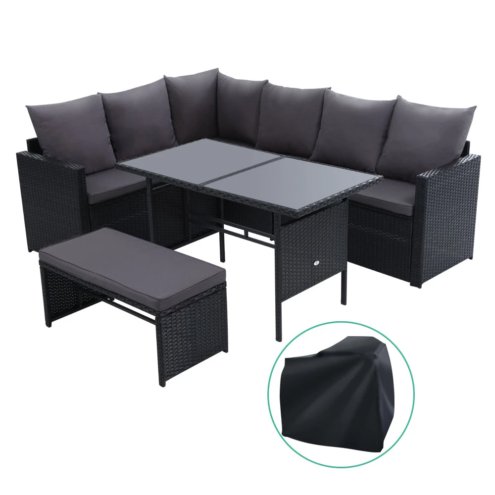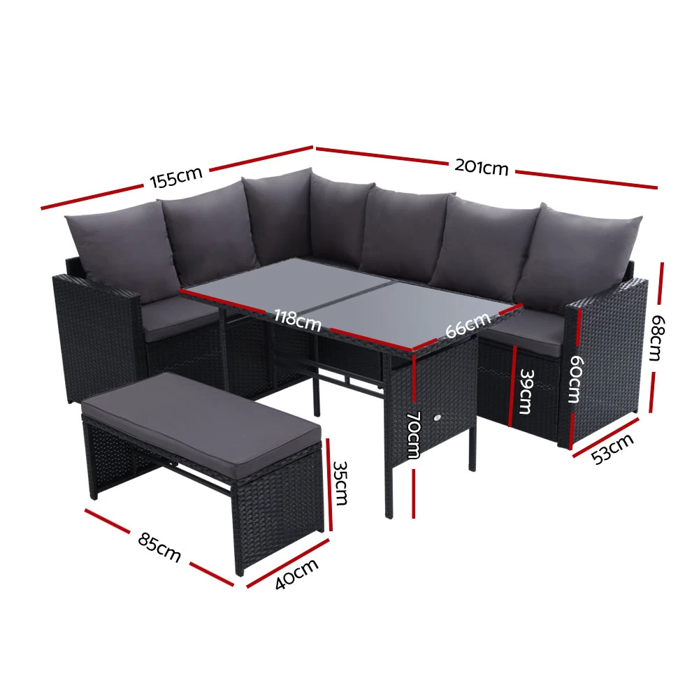 Invite your friends and family over for a garden party or just sit back and relax with our Gardeon Oudoor Sofa Dining Set. Being a 8-seater, the dining set provides enough room for all your guests to sit or for you to have a lie down and enjoy a book. You can arrange the seats in various ways depending on your needs and there are hooks included to secure the seats firmly together. The sofa is made of sturdy powder-coated steel frame with quality PE wicker finish that not only looks stylish but is perfect for outdoor use as it is both UV-resistant and weatherproof. The cushions and pillows on the sofa are 5cm thick to provide ultimate comfort and are waterproof as well. The set also includes a matching table that has a 5mm tempered glass top with buffers for added protection. There is a bonus storage cover for you can protect the set from sun and rain when not in use, so that you can keep enjoying your garden parties for many years to come.