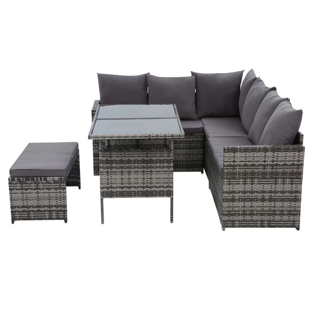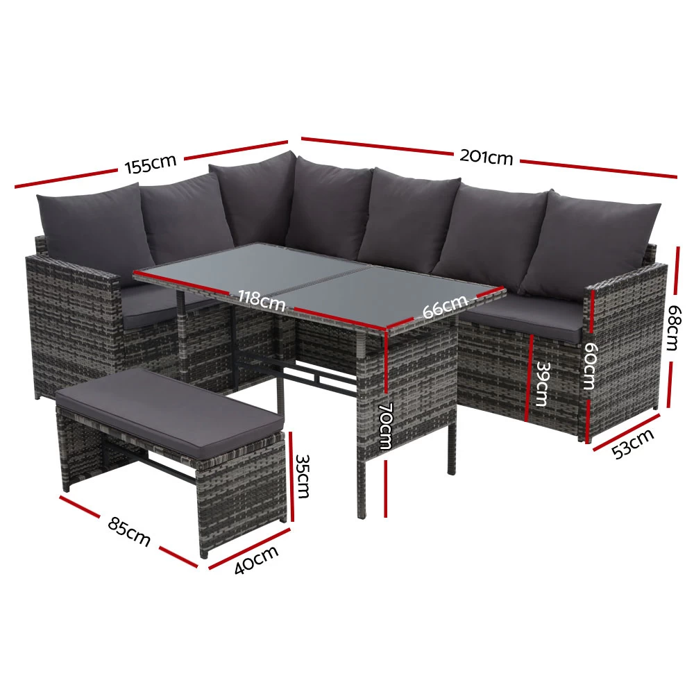 Invite your friends and family over for a garden party or just sit back and relax with our Gardeon Oudoor Sofa Dining Set. Being a 8-seater, the dining set provides enough room for all your guests to sit or for you to have a lie down and enjoy a book. You can arrange the seats in various ways depending on your needs and there are hooks included to secure the seats firmly together. The sofa is made of sturdy powder-coated steel frame with quality PE wicker finish that not only looks stylish but is perfect for outdoor use as it is both UV-resistant and weatherproof. The cushions and pillows on the sofa are 5cm thick to provide ultimate comfort and are waterproof as well. The set also includes a matching table that has a 5mm tempered glass top with buffers for added protection. There is a bonus storage cover for you can protect the set from sun and rain when not in use, so that you can keep enjoying your garden parties for many years to come.