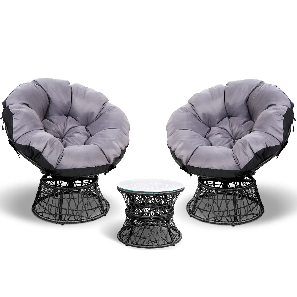 Feel good with every seating in all seasons with Papasan chairs and table set. With 10cm thick padding, the chairs provide you with pampered comfort. Featured with UV-resistant PE wicker and heavy-duty steel frame, the chairs and table set looks stylish and it is prefect for your recreation in your garden or balcony. Not least, the chair is 360 degree rotatable for easy facing in any direction.