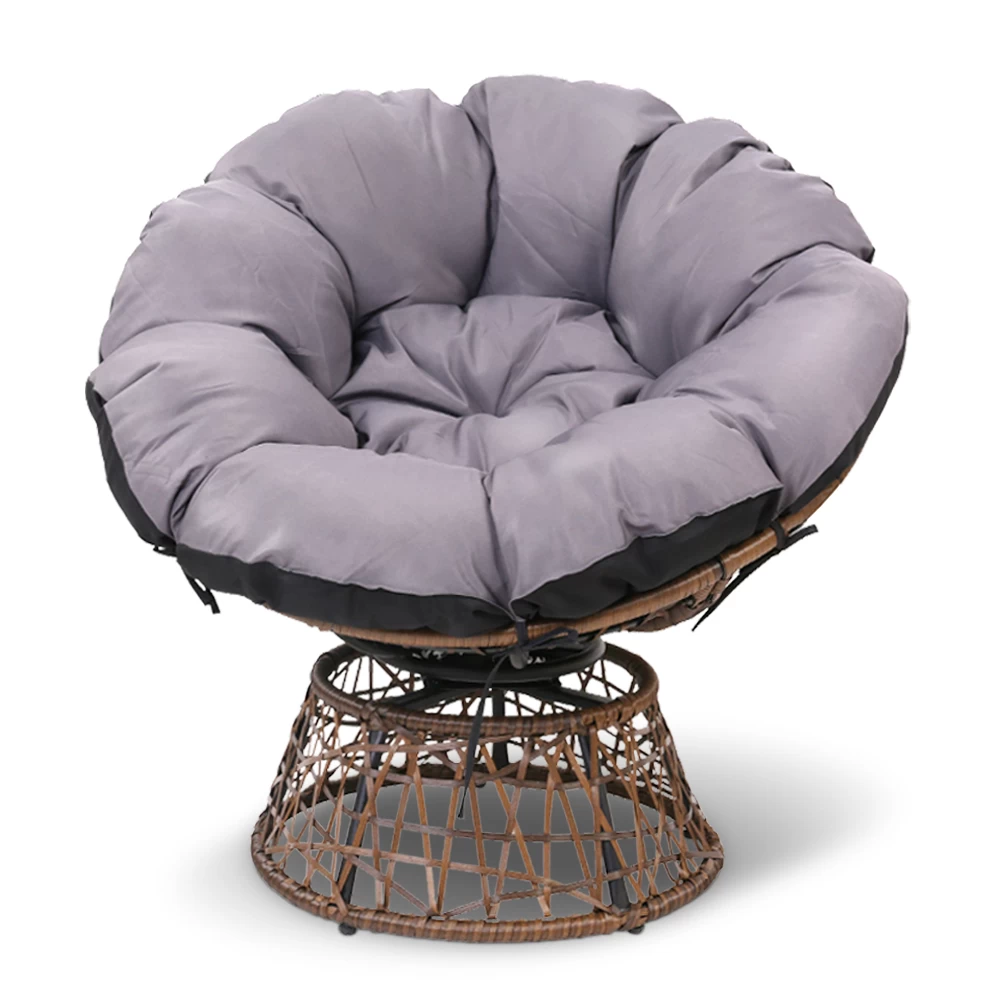 Our papasan chair is made of UV-resistant PE wicker and features wicker weaving around a durable steel frame. It is 360 ° rotatable and the cushion covers are also non-fading and removable for easy cleaning. It has a weight capacity of 150kg.