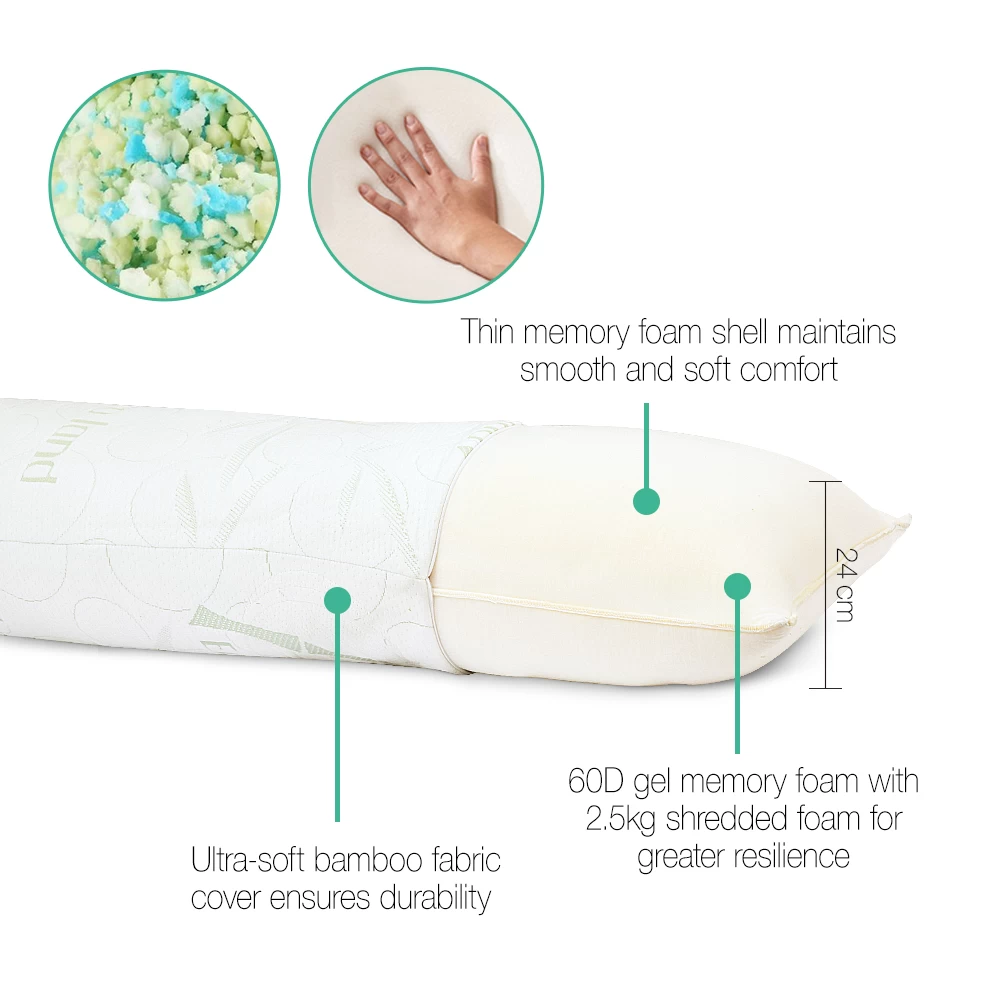 Filled with 60D gel memory foam and 2.5kg shredded foam, our Body Pillow easily conforms to your shape for a more comfortable sleeping experience. More importantly, with its full length design, our Body Pillow is long enough to offer exytended support in any sleeping position, particularly if you prefer sleeping sideways. You get instant relief and support with every use of the Body Pillow. In fact, it is also a perfect pregnancy pillow to help reduce aches, soreness and pressure during all stages of pregnancy and subsequent maternity requirements. Not least, the cool and breathable bamboo fabric cover is soft, allergen-free and breathable, allowing air to flow through the pillow for more luxurious comfort. The zipped cover is also machine washable for added convenience and hygiene.