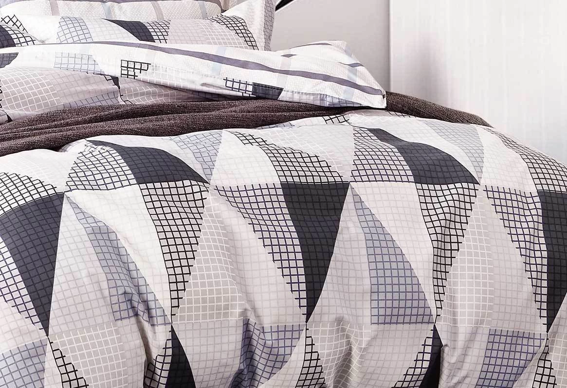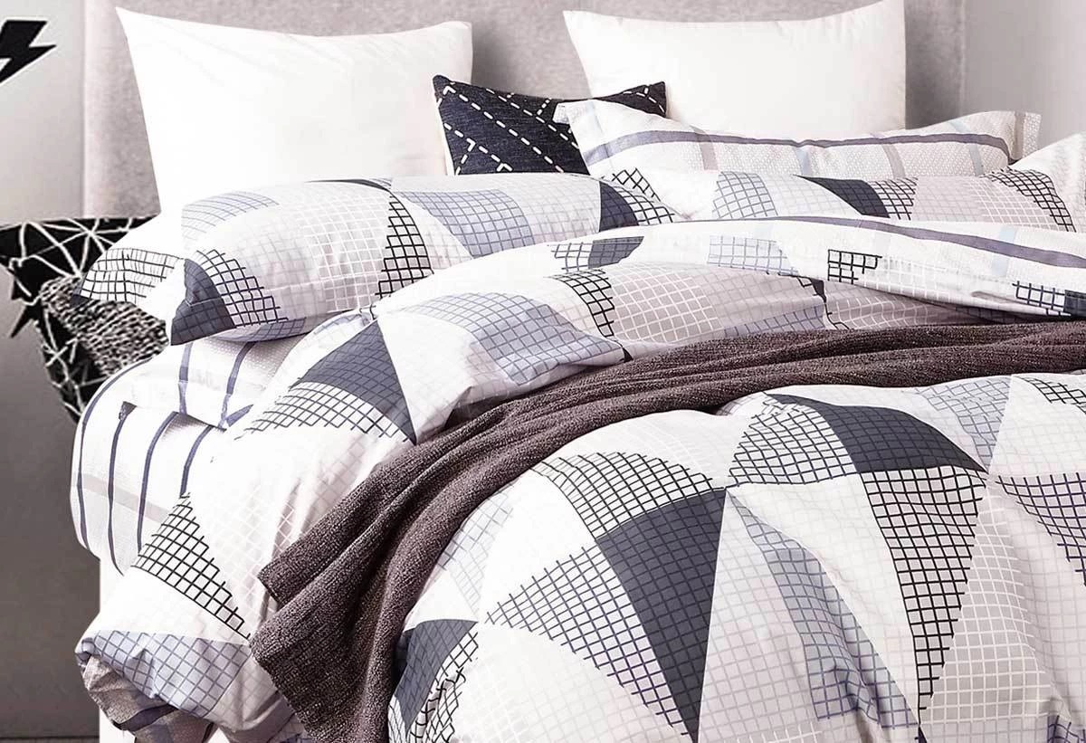 100% cotton quilt cover set / doona cover set features a design of gray, black and white geo repeat of triangles.