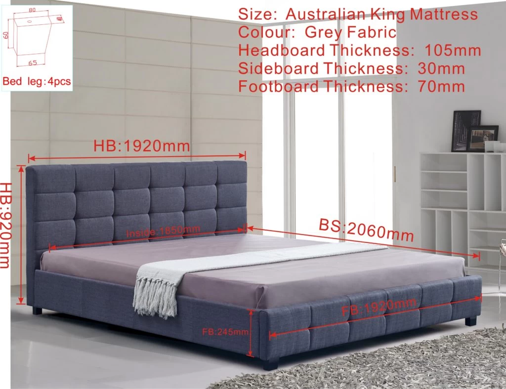 An exceptionally sturdy all-wood frame and support slats provide a rock-solid foundation for your mattress that will surely lead to many restful nights. The Linen Fabric covering is similarly durable, not to mention easy to clean. The frame is designed to accommodate standard King-sized mattresses with dimensions of 183 x 203 cm (mattress and linens not included). The headboard is 98 cm tall (6cm leg & 92cm headboard) from top to bottom, and the overall dimensions of the bed frame are 206 cm x 192 cm.