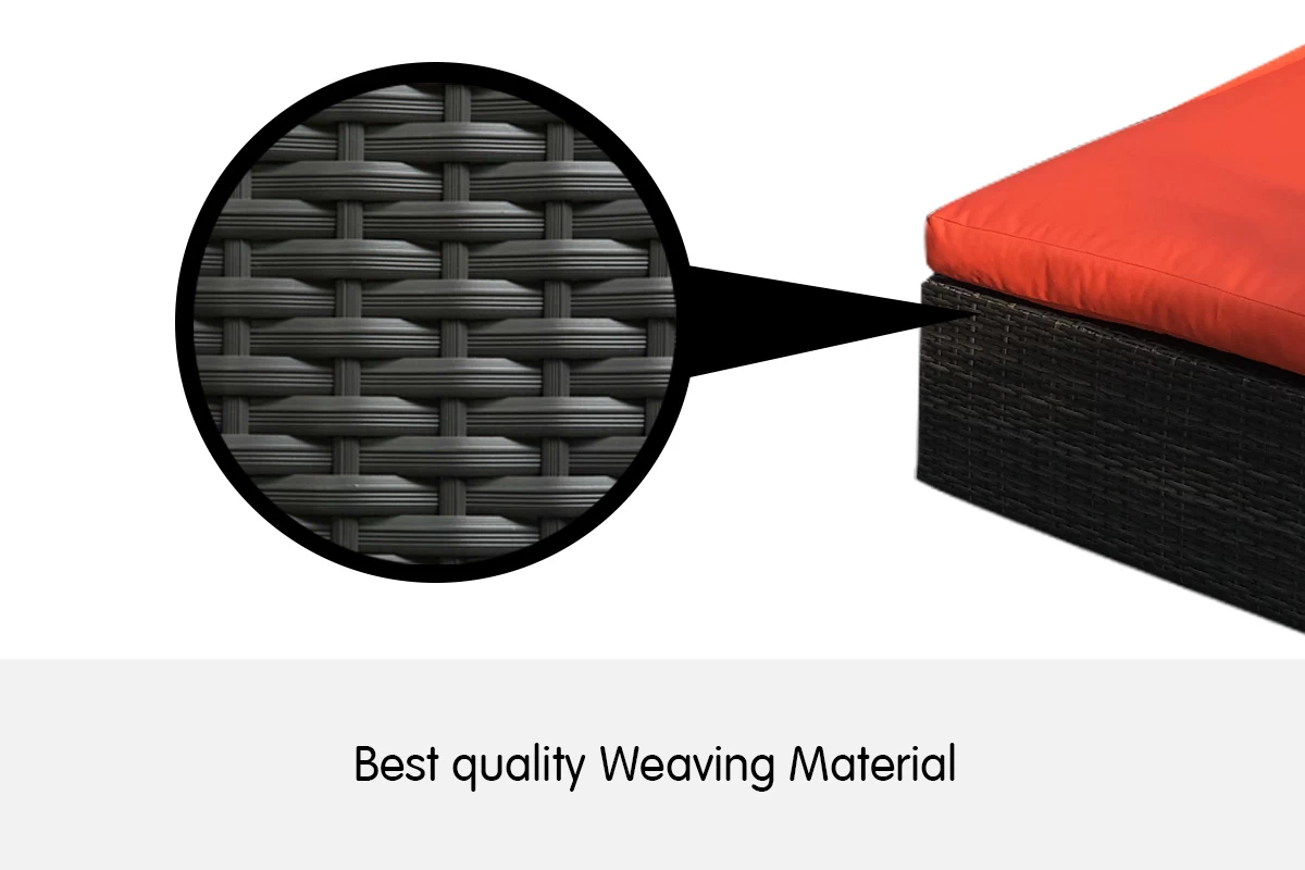 It features strong and sturdy iron frame, hand woven with weather resistant PE rattan wicker. The cushions are made from a high quality water-resistant staple fabric, which provides extra comfort and durability in the harsh Australian climate.