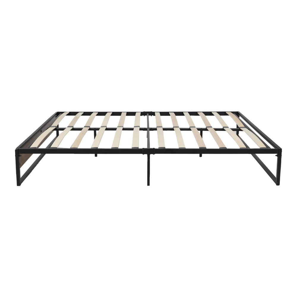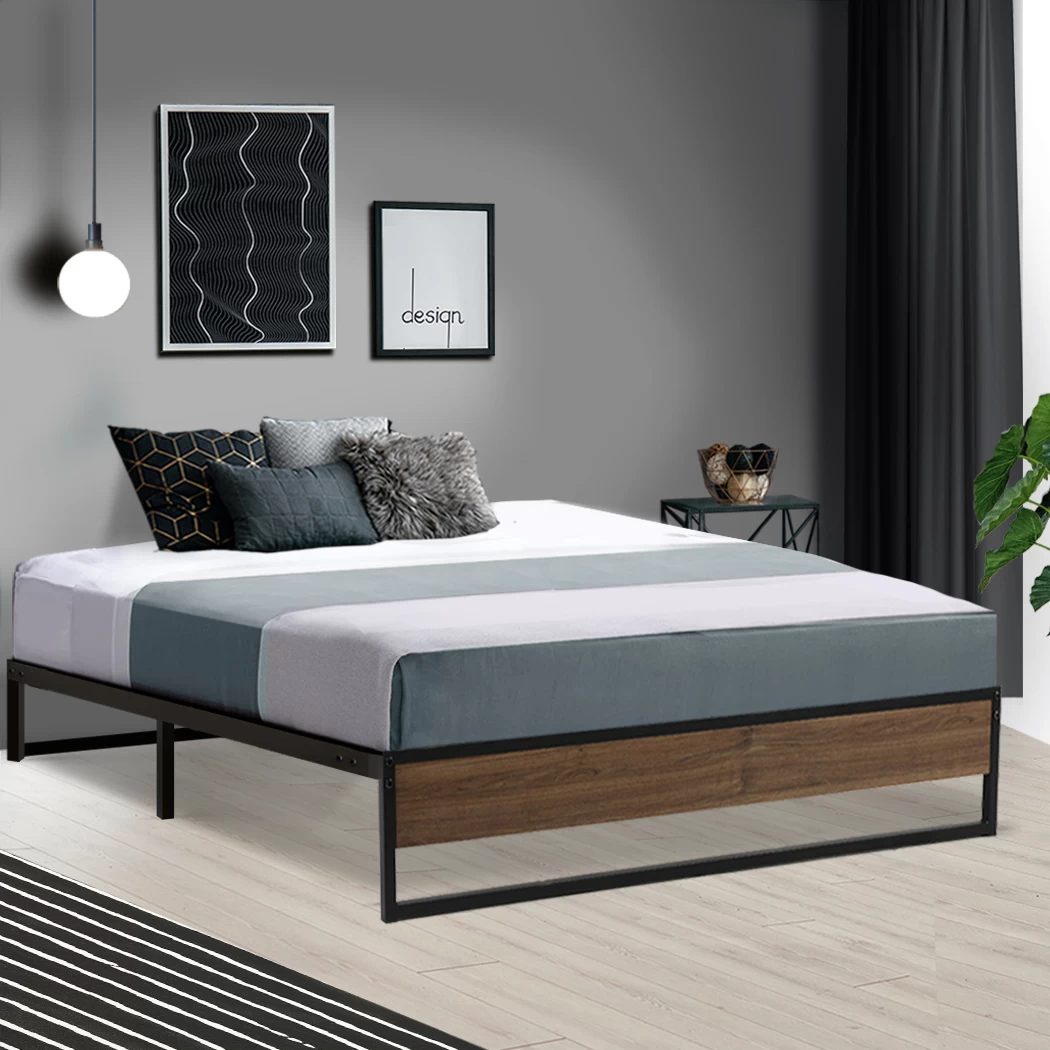 Metal and wood in perfect harmony. Our Oslo Bed Frame is truly a stylish addition to any bedroom. Simple in design, the bed frame is meticulously constructed in sturdy steel and 15mm thick MDF with PVC for durability and strength. The sleek black powder-coated steel and dark wood accents lend real industrial cred to your bedroom for some standout decoration. Across the frame, evenly spaced slats provide good weight distribution as well as ensuring that the mattress stays in place even with every twist and turn of your sleep. The central support beam further steadies the bed under robust use. Designed to fit standard size mattresses effortlessly, our eclectic bed frame is guaranteed to give you pleasant dreams with every sleep