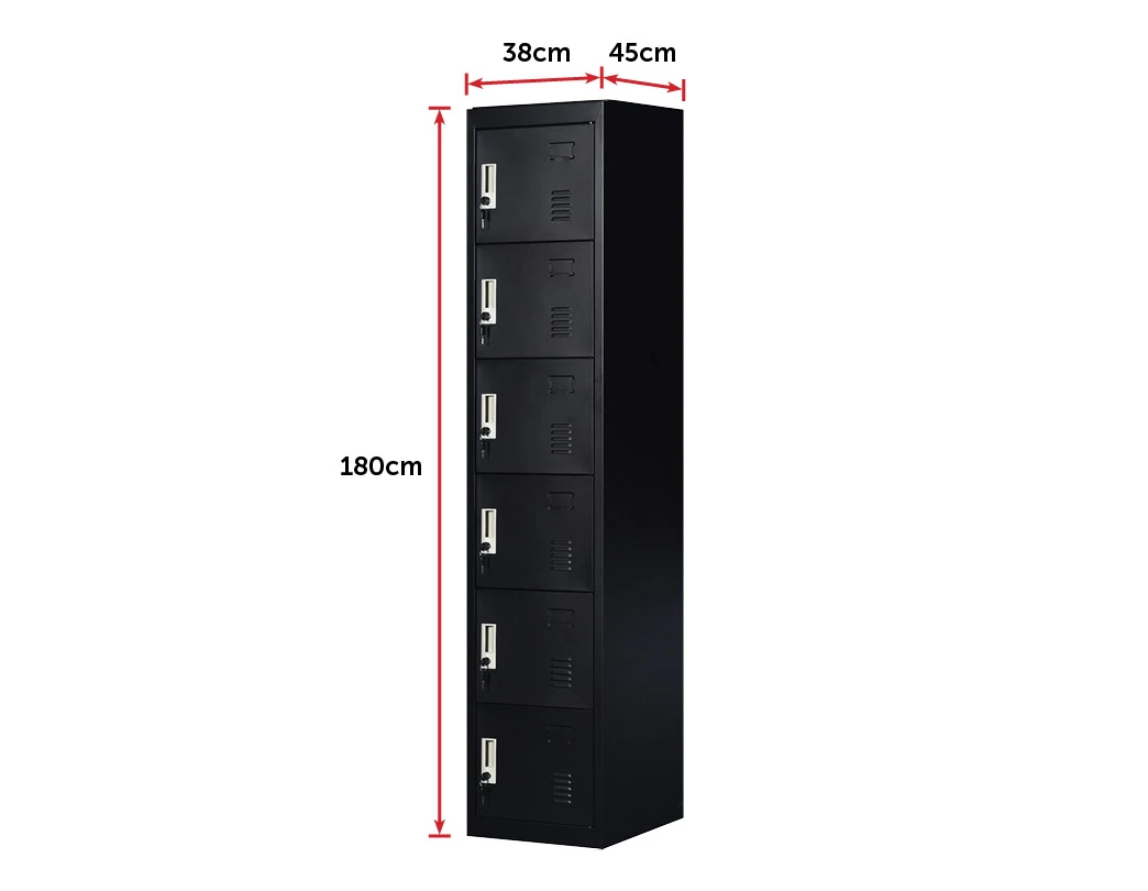 The unit measures 1800 x 380 x 450mm, and several units can be seamlessly placed side-by-side. Made with a durable steel in black, the unit features six stacked square lockers with vents for air circulation and spaces for name tags or plates. The unit can hold up to a maximum weight capacity of 80kgs in total.
